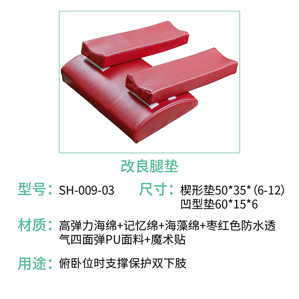 這款改良俯臥位體位墊能讓手術視野暴露更充分,便于手術醫(yī)生操作、為了避免壓瘡的發(fā)生。手術室對俯臥位體位擺放很是嚴格,故此蒙泰護理廠家與陸軍總醫(yī)院共同研發(fā)與生產(chǎn)了這款海綿體位墊中的改良腿墊;其產(chǎn)品材質由:高彈力海綿+記憶綿+海藻綿+棗紅色防水透氣四面彈PU面料+魔術貼;規(guī)格有:楔形墊50*35*(6-12)、凹型墊60*15*6、楔形墊50*28*(4-8)、凹型墊50*15*6;產(chǎn)品主要用途:俯臥位時支撐保護雙下肢